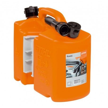 Bidón Combinado Profesional Naranja 5/3L STIHL: Este bidón profesional es ideal para almacenar y transportar combustibles y aceites de manera segura. Con una capacidad de 5 litros para el combustible y 3 litros para el aceite, su diseño robusto y fácil de manejar garantiza un transporte cómodo y sin derrames, perfecto para el uso en exteriores y trabajos exigentes.
