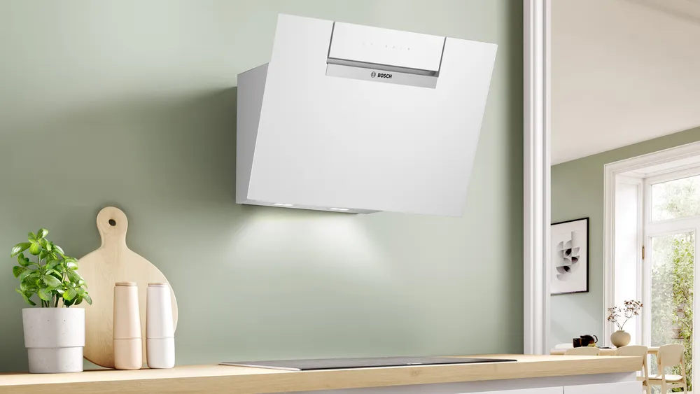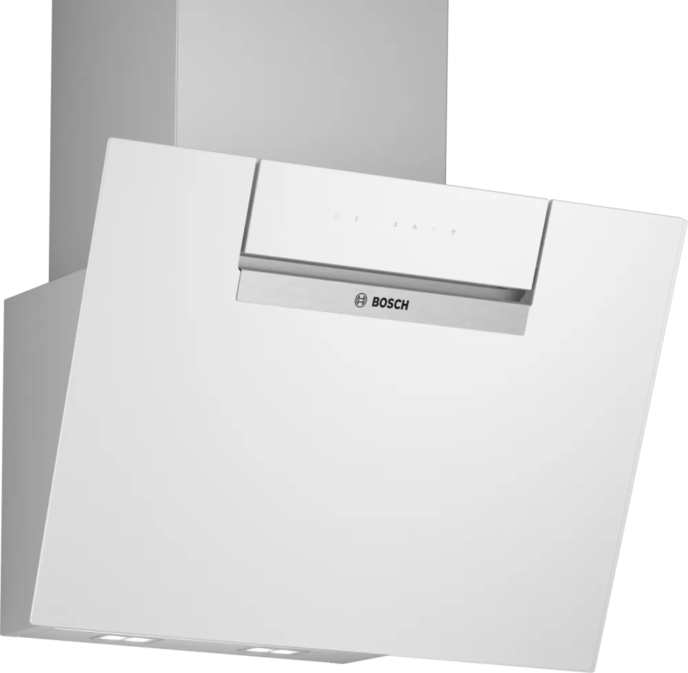 Bosch- Campana decorativa de pared, 60 cm, Cristal blanco, Serie 4,DWK67FN20, de 60 cm en cristal blanco. Elegante y potente, ideal para cocinas modernas, con alto rendimiento de extracción y diseño inclinado para mayor comodidad.