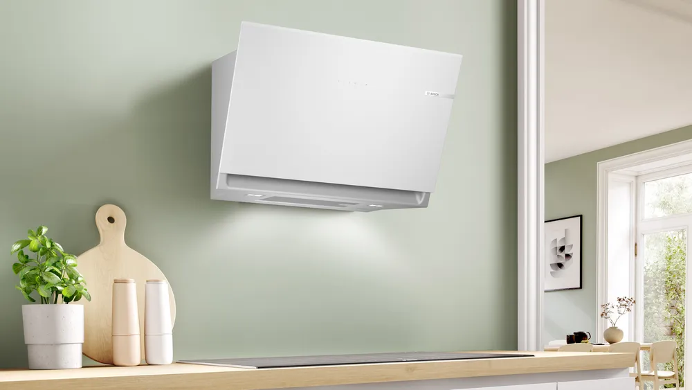 Campana decorativa de pared Bosch Serie 6 DWK81AN20, de 80 cm en cristal blanco. Diseño moderno y elegante, con potente capacidad de extracción, motor EcoSilence y control táctil para una cocina silenciosa, eficiente y estilizada.
