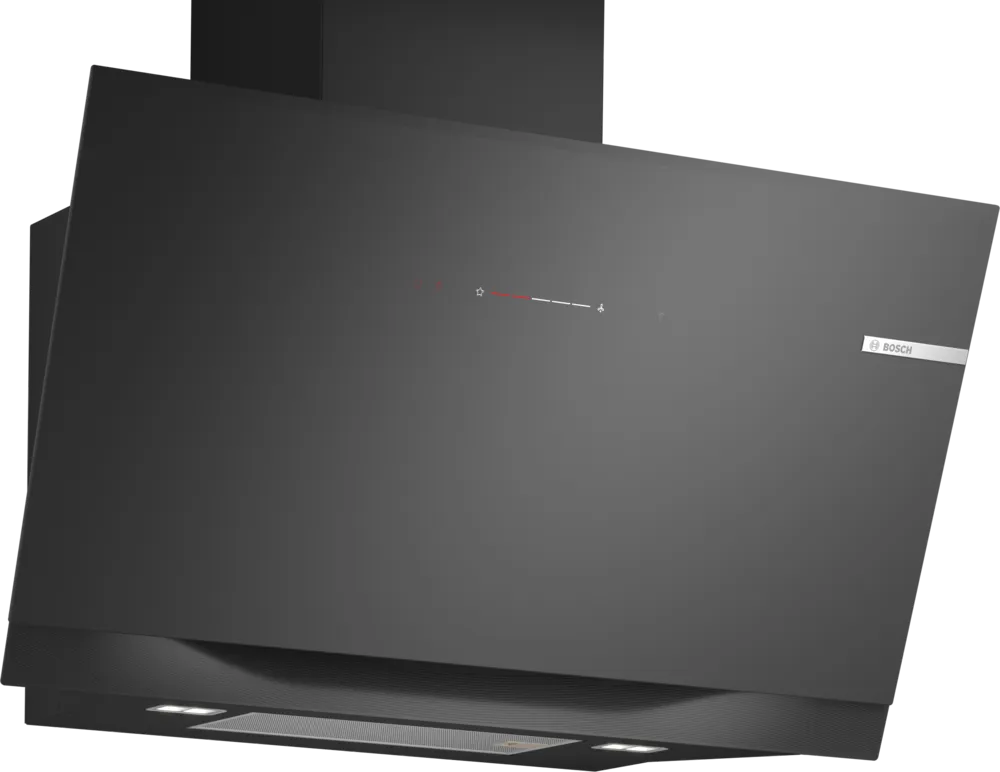 Campana decorativa de pared Bosch Serie 8 DWK91LT60, de 90 cm en cristal negro. Estilo sofisticado y alto rendimiento con motor EcoSilence, sensor PerfectAir, control táctil y conectividad Home Connect para una cocina silenciosa, eficiente e inteligente.