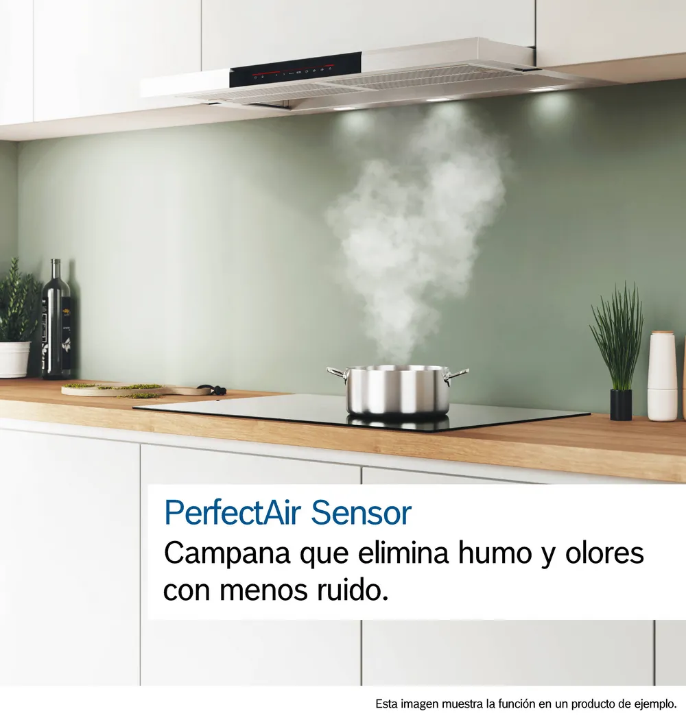 - Perfect Air Sensor: Campana que elimina humo y olores con menos ruido. ¿Te gustaría cocinar con menos ruido y sin olores? Nuestro PerfectAir Sensor es lo que estabas buscando. Controla en todo momento la calidad del aire para ajustar la potencia de extracción en función del nivel de humo, vapor y olores. Además, extrae a la potencia mínima necesaria reduciendo el ruido al máximo. De este modo, tu cocina está libre de olores y ruido innecesario. Lo mejor de todo es que, cuando acabas de cocinar, sigue funcionando un tiempo hasta eliminar todo el humo y el vapor, para evitar la condensación y los malos olores. Empieza a disfrutar de la cocina sin preocuparte por la campana.
