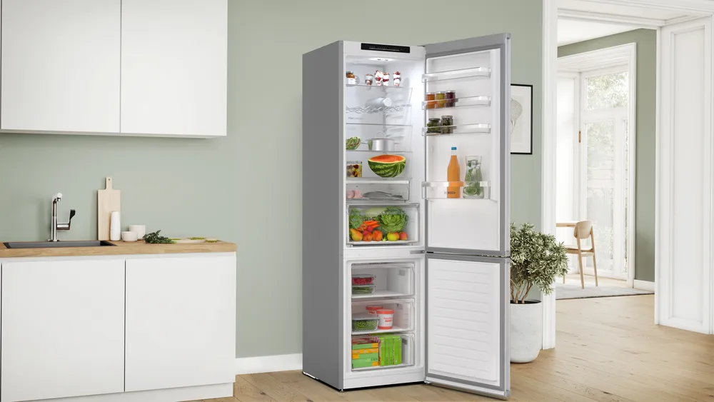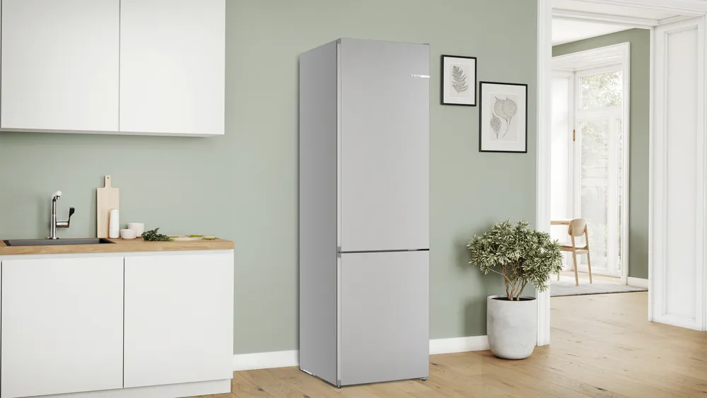 Cuando compres un frigorífico, fíjate en la etiqueta de clase de eficiencia energética. La etiqueta energética va de la clase A a la G, y contiene información importante sobre la eficiencia, el nivel de ruido, la capacidad y el consumo de energía del aparato. Los frigoríficos combinados Bosch están diseñados para obtener la máxima eficiencia energética, sin reducir el rendimiento. De este modo, puedes estar seguro de conseguir la mejor conservación de tus alimentos mientras ahorras energía.
