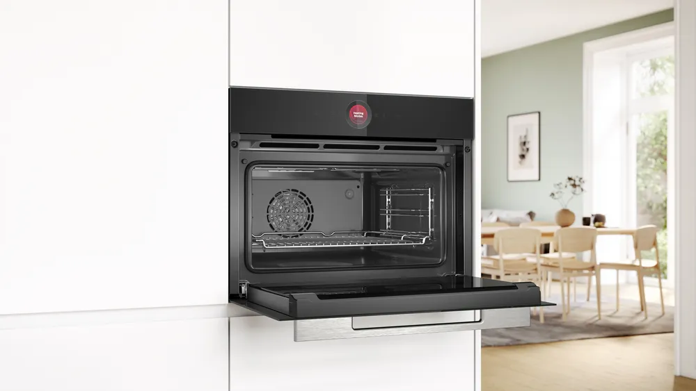 El Bosch CBG7341B1 es un horno compacto multifuncional de 60 x 45 cm, perteneciente a la Serie 8 de Bosch. Su elegante diseño en negro y sus avanzadas características lo convierten en una opción destacada para cocinas modernas.