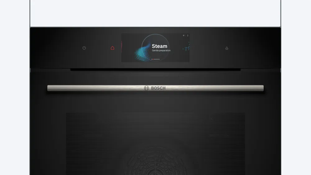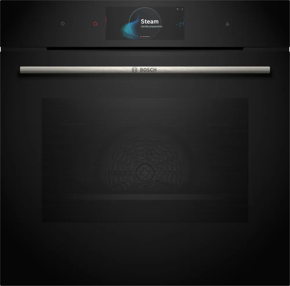 Bosch Horno con Vapor HRG7784B1.Horno empotrable de 60 x 60 cm en acabado negro, parte de la Serie 8 de Bosch, diseñado para ofrecer lo mejor de la cocción a vapor. Su tecnología de vapor combinado con aire caliente permite una cocción perfecta, manteniendo los alimentos jugosos y llenos de sabor. Con funciones avanzadas como autolimpieza pirolítica, control preciso de temperatura y una interfaz táctil intuitiva, garantiza comodidad y eficiencia. Su diseño elegante y sofisticado lo convierte en una opción ideal para quienes buscan resultados profesionales y una estética moderna en su cocina.