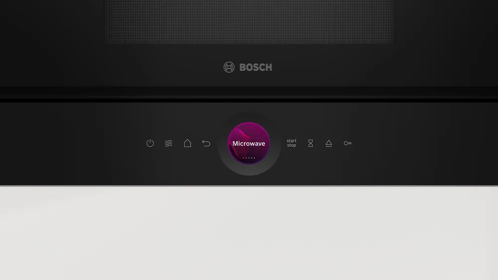 Microondas integrable Bosch Serie 8 en negro, con 21 litros de capacidad, tecnología Inverter para calentado uniforme, grill de 1300W y diseño sin plato giratorio para facilitar la limpieza. Panel táctil intuitivo y 10 programas automáticos. Ideal para cocinas modernas.