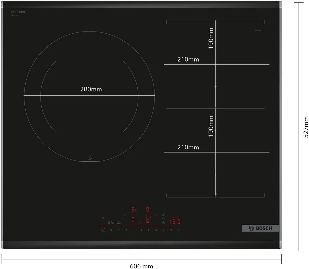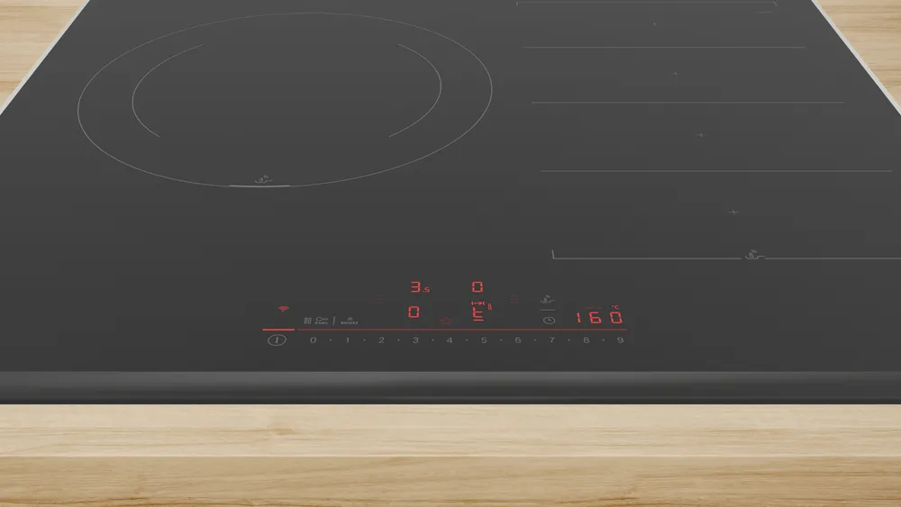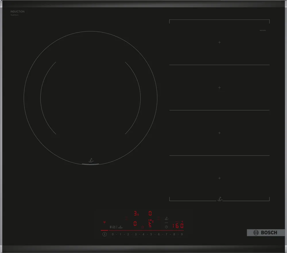 La placa de inducción Bosch PXJ675HC1E de 60 cm, perteneciente a la Serie 6, destaca por su diseño elegante con perfiles metálicos y tecnología avanzada para una cocción eficiente y conectada.