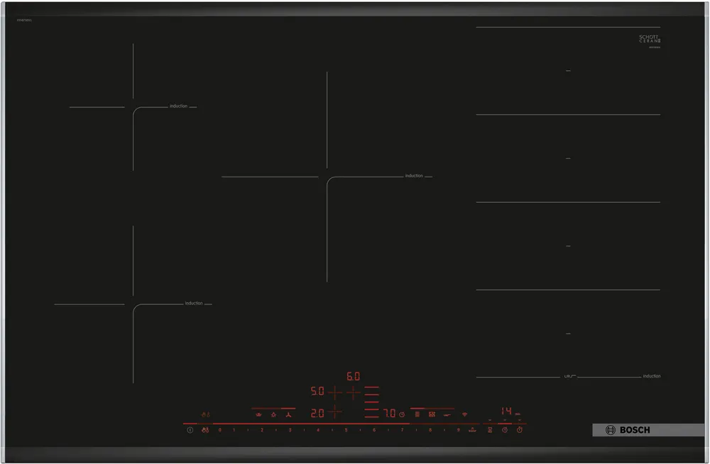 La placa de inducción Bosch PXV875DV1E de la Serie 8 ofrece un diseño elegante con perfiles en acero inoxidable y una superficie de cristal negro.
