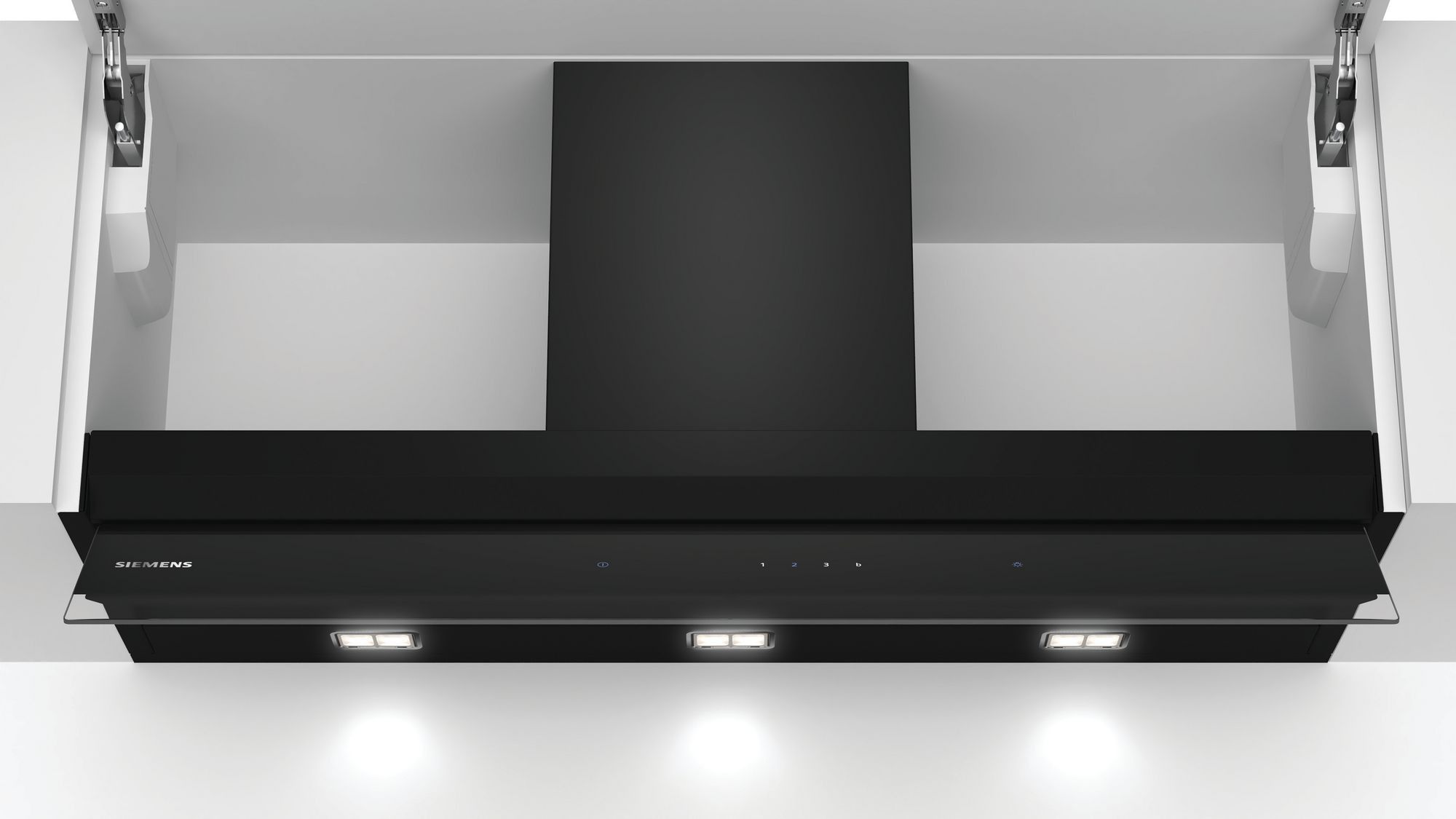 La campana decorativa integrada Siemens iQ500. Su elegante diseño en cristal negro no solo se adapta a cualquier ambiente moderno, sino que también es altamente funcional.