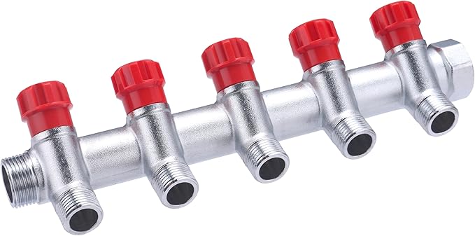 Este colector cuenta con una grifería de control de color rojo integrada para facilitar la apertura y cierre del paso de agua, lo que permite un control individual por circuito o ramal. Las 5 salidas con rosca macho de 1/2″ son compatibles con la mayoría de las conexiones estándar de fontanería, lo que facilita una instalación rápida y sin complicaciones.