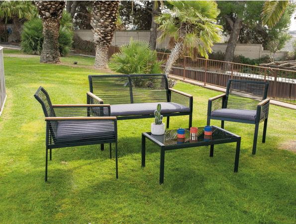 - Estructura de acero y ratán sintético: Materiales resistentes y duraderos para el uso exterior.