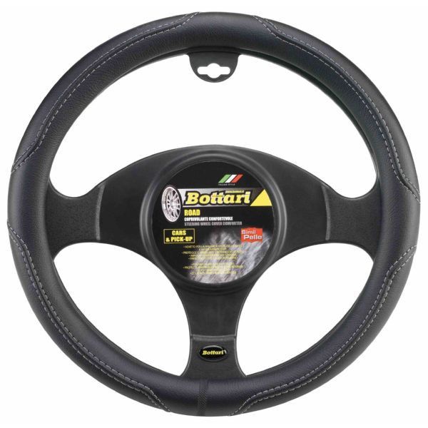La funda cubrevolante Road de Bottari en elegante combinación negro y gris es ideal para proteger el volante del desgaste diario, mejorar el agarre y aportar un toque deportivo y moderno al interior del coche. Su fabricación con materiales de alta calidad garantiza resistencia, durabilidad y una instalación sencilla sin necesidad de herramientas.