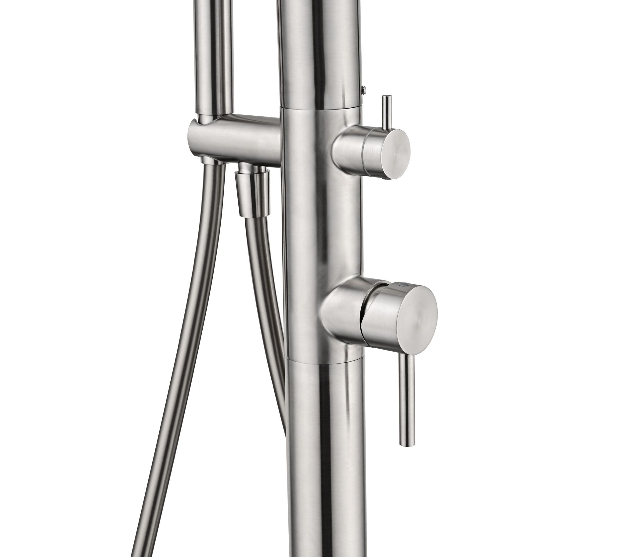 Destaca por su barra de Ø50 mm de grosor especial, que le aporta robustez y durabilidad, con un difusor superior giratorio 360º de Ø250 mm que incluye sistema anti-calcáreo y rosca estándar Ø1/2″. Además, incorpora grifería monomando de 2 vías, lo que permite el uso de agua fría y caliente mediante inversor para seleccionar entre el difusor superior o el mango de ducha.