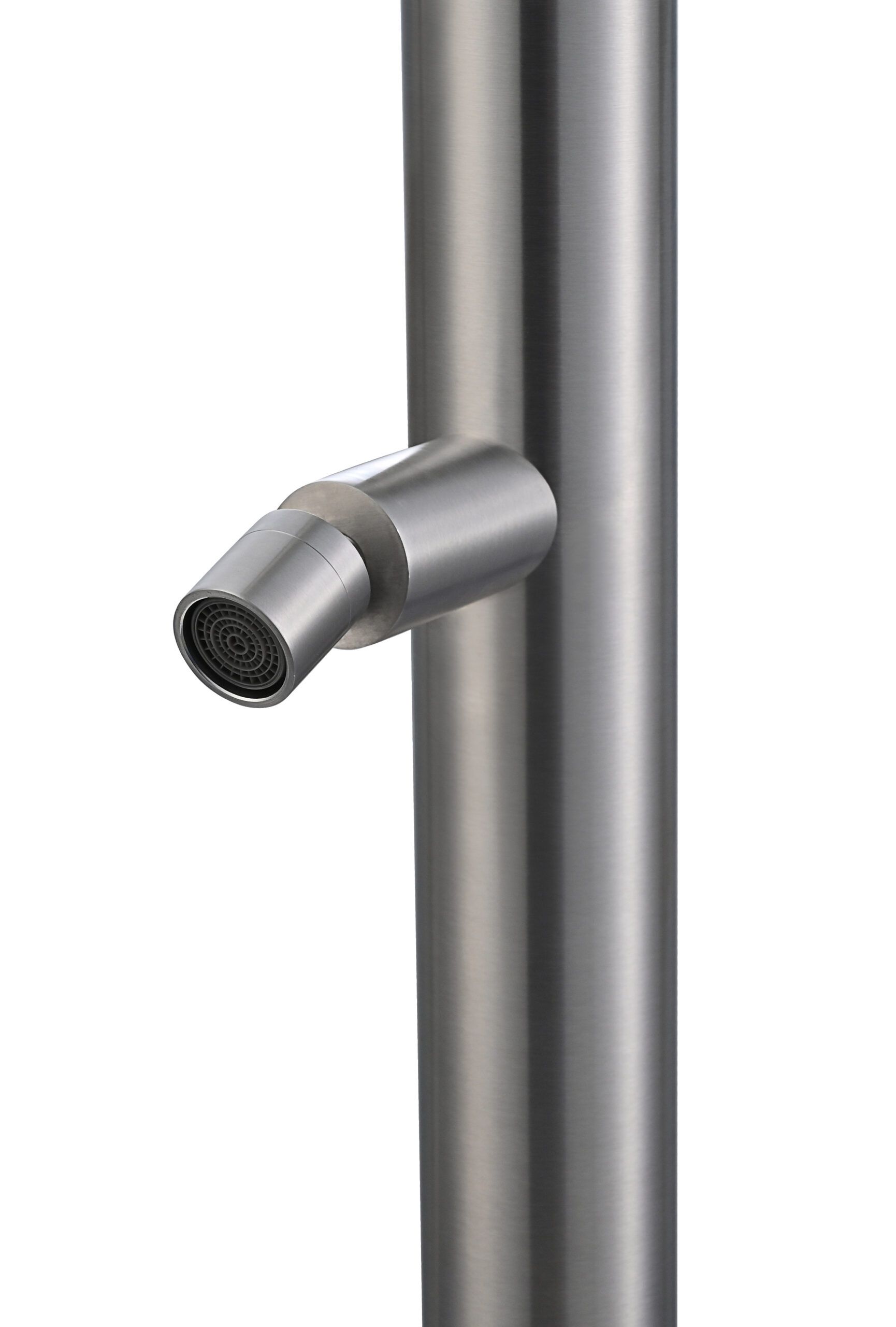 Equipada con grifería monofluido de 2 vías, suministra agua fría tanto al difusor superior como al lava-pies. Su instalación es sencilla mediante latiguillo recto ø1/2” (1300/12 mm). La ducha incluye un pedestal embellecedor circular de ø160 mm y una base de fijación de ø152 mm, todo en acero S.316, para una presentación estética y sólida instalación.