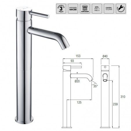 Diseño Alto: Su estructura de altura permite una instalación cómoda en lavabos de mayor profundidad o lavamanos sobre encimera.