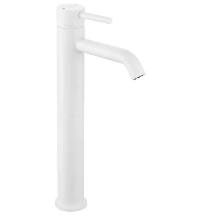 El grifo de lavabo alto Aquassent LIKE en blanco se destaca por su diseño moderno y altura, ideal para lavabos amplios. Su acabado blanco aporta frescura al baño.»