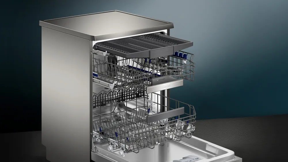 Cómoda y rápida limpieza garantizada. Las cestas flexComfort cuentan con un diseño elegante que ofrece mucha libertad al cargar y descargar. Ya sean platos, ollas, tazas o copas de vino, en los lavavajillas Siemens con cestas flexibles, cada plato encuentra rápidamente su lugar. Gracias al renovado sisistema de deslizamiento, ahora se puede colocar vasos y copas delicados en el lavavajillas. Además, las nuevas ruedas de baja fricción hacen que la carga y descarga sea más suave.