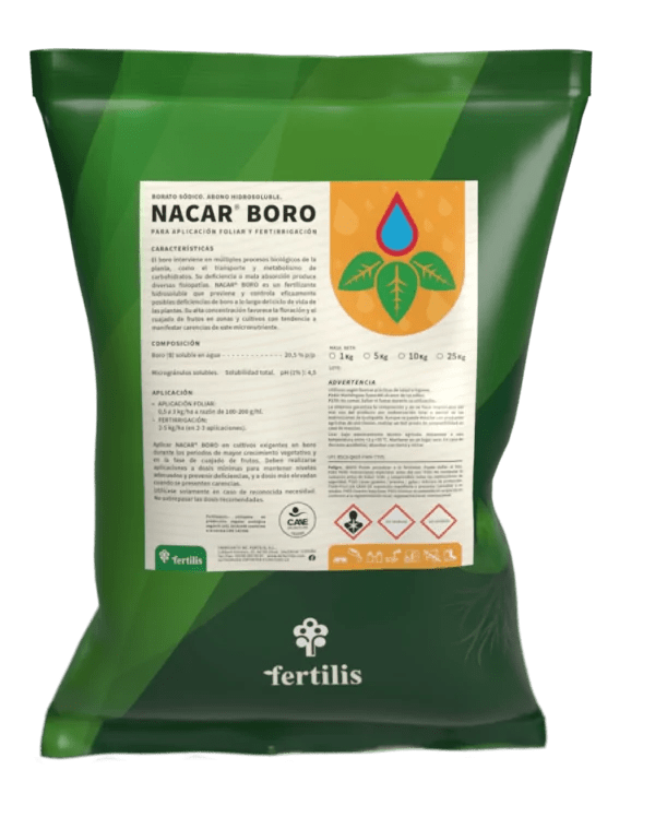 El fertilizante Nacar Boro 1 kg Fertilis es la solución ideal para prevenir y corregir deficiencias de boro en tus cultivos. Su fórmula de alta concentración asegura una rápida absorción, favoreciendo el desarrollo floral, la formación de frutos y la calidad general de las cosechas. Compatible con aplicaciones foliares y en el suelo, es perfecto para una nutrición completa y efectiva.