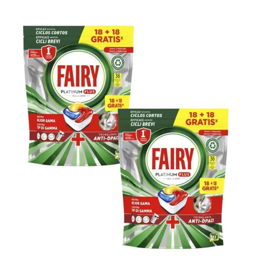 El Pack 2 Cápsulas Fairy Lavavajillas Platinum Plus Limón (18+18) ofrece resultados insuperables en limpieza y desengrase. Estas cápsulas avanzadas eliminan residuos difíciles, grasas incrustadas y manchas difíciles, dejando la vajilla impecable con un aroma fresco a limón. Su fórmula todo en uno protege los platos y ayuda a prevenir marcas de agua, asegurando un brillo impecable. Compatible con todo tipo de lavavajillas.