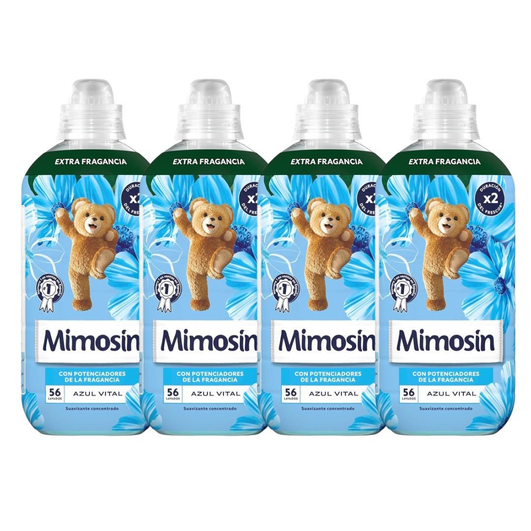 El Pack 4 Mimosín Suavizante Concentrado Azul Vital es ideal para quienes buscan frescura y suavidad en su ropa. Con su fragancia revitalizante, este suavizante deja las prendas suaves al tacto y con un aroma fresco que perdura. Cada botella está diseñada para 56 lavados, sumando un total de 224 lavados en este práctico y económico pack. Su fórmula concentrada asegura un rendimiento superior mientras protege las fibras de tus prendas.