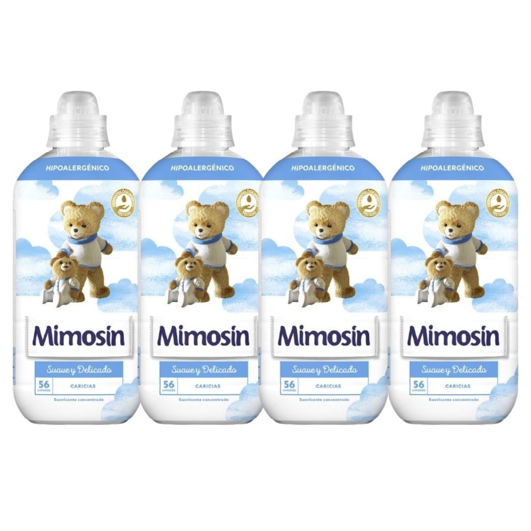 El Pack de 4 botellas de Mimosín Suavizante Concentrado Caricias ofrece una fragancia envolvente y duradera para tu ropa, con una fórmula que suaviza cada fibra, facilitando el planchado y dejando un aroma fresco y agradable. Con un total de 224 lavados, este pack es ideal para mantener tus prendas suaves y perfumadas por más tiempo.