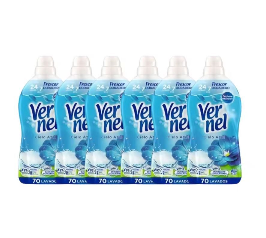El PACK 6 Suavizante Vernel Concentrado Cielo Azul (70 lavados) ofrece una experiencia de frescura y suavidad excepcional. Su fórmula concentrada te permite obtener hasta 70 lavados con una cantidad mínima de producto. La fragancia de cielo azul envuelve las fibras textiles, dejando un aroma fresco y ligero que perdura durante todo el día. Además, su acción suavizante cuida y mantiene las prendas suaves, proporcionando un toque de frescura y suavidad con cada lavado.