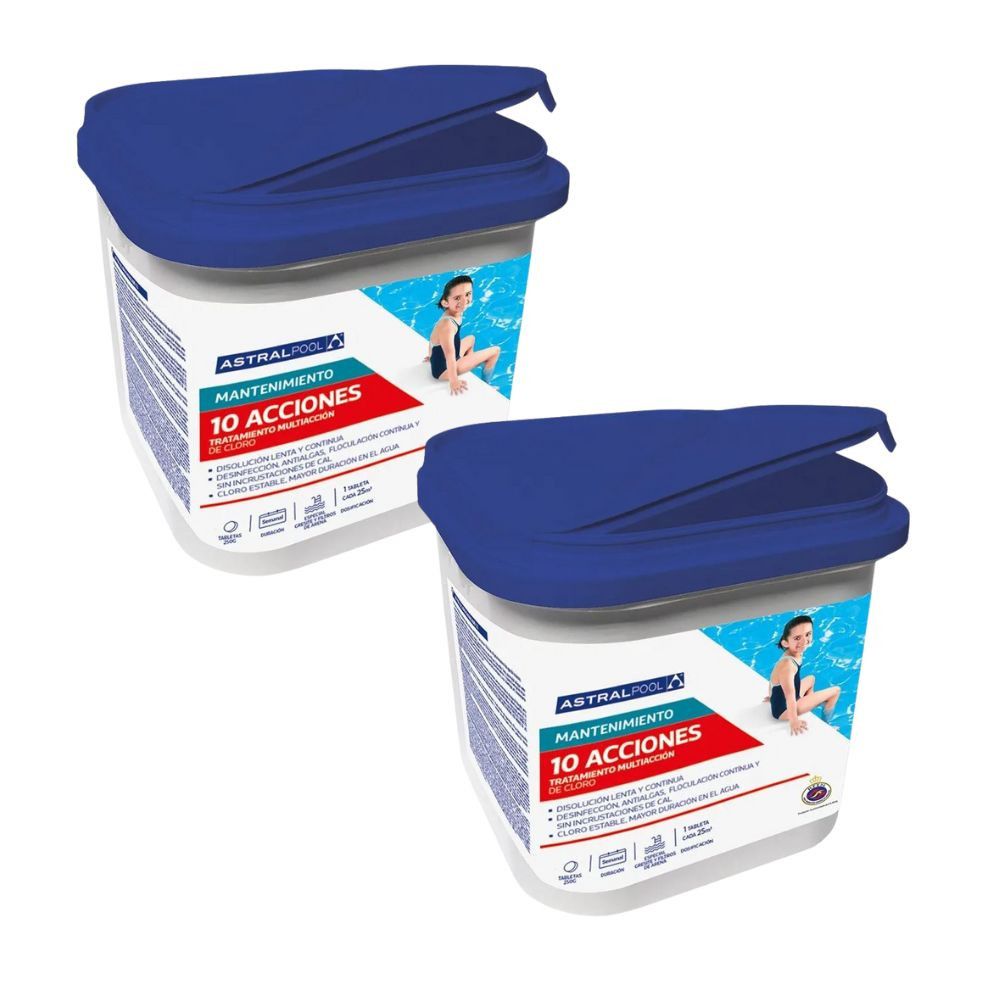 El Pack de 2 – Cloro 10 acciones 5 kg Astral es una solución avanzada para el mantenimiento y limpieza de tu piscina. Este cloro multiacción ofrece 10 beneficios en un solo producto: elimina bacterias, algas, purifica el agua, estabiliza el pH, previene la formación de incrustaciones y mucho más. Ideal para mantener el agua cristalina y saludable durante toda la temporada. Con 2 unidades de 5 kg, es perfecto para tratamientos regulares y de choque.