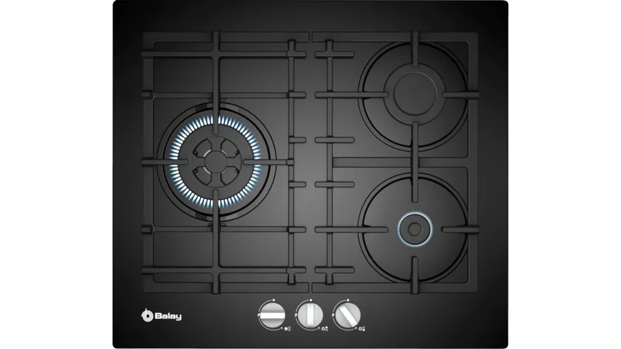 La Balay 3ETG563HB es una placa de gas de 60 cm con un diseño elegante en cristal templado negro, que aporta un toque moderno y sofisticado a tu cocina. Equipada con tres quemadores y un potente quemador wok, permite cocinar con rapidez y precisión.