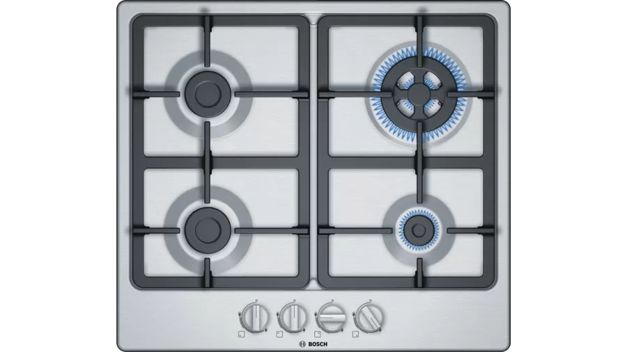 La Bosch PGH6B5B90 es una placa de gas de 60 cm diseñada para ofrecer máxima potencia y control preciso en la cocina. Con 4 quemadores de distintos tamaños, incluyendo un quemador wok de alta potencia, permite cocinar con rapidez y eficiencia.