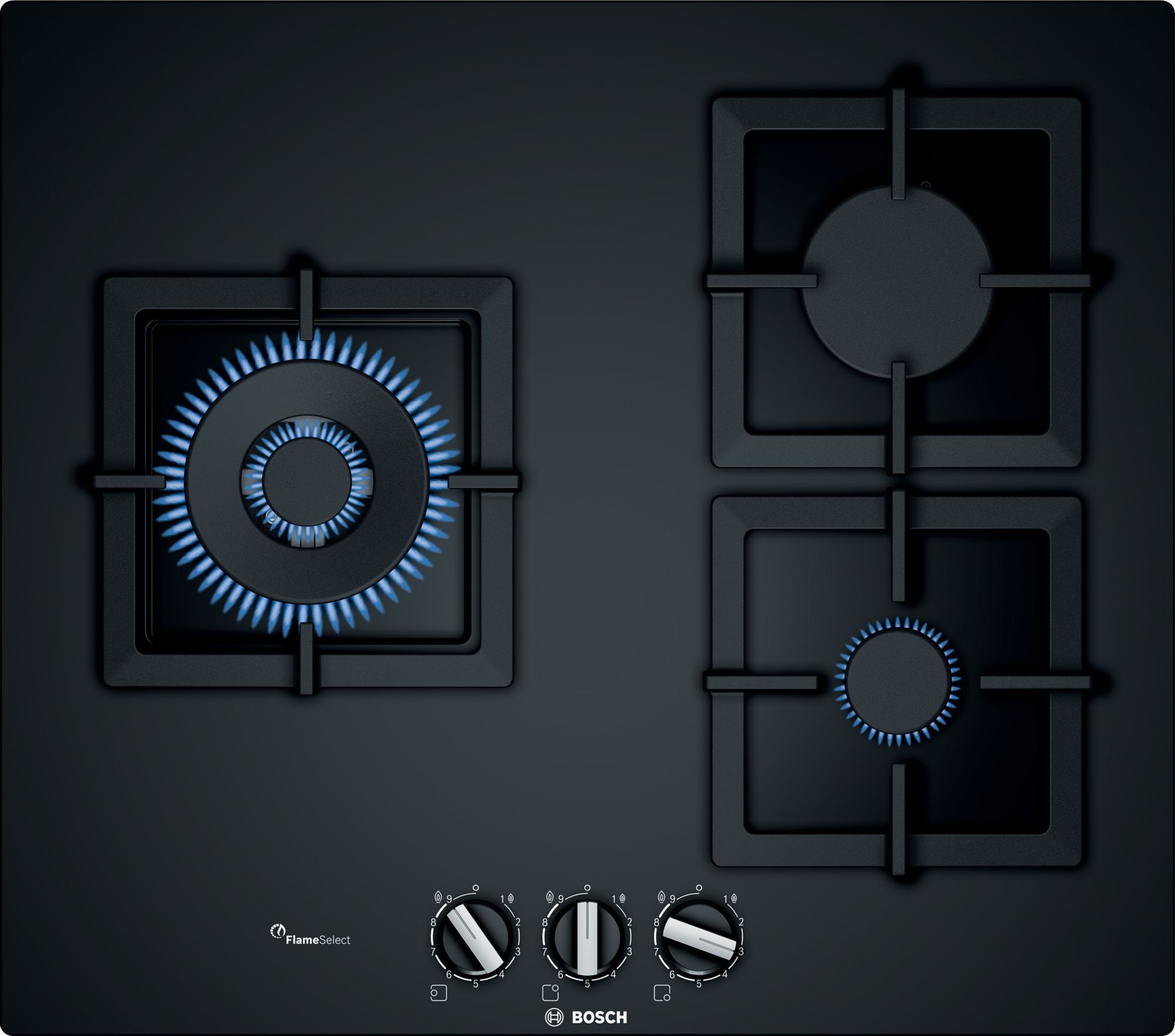 Placa de gas Bosch PPC6A6B20, 60 cm, vidrio templado negro, con FlameSelect y rejillas de hierro fundido para una cocina moderna y funcional.