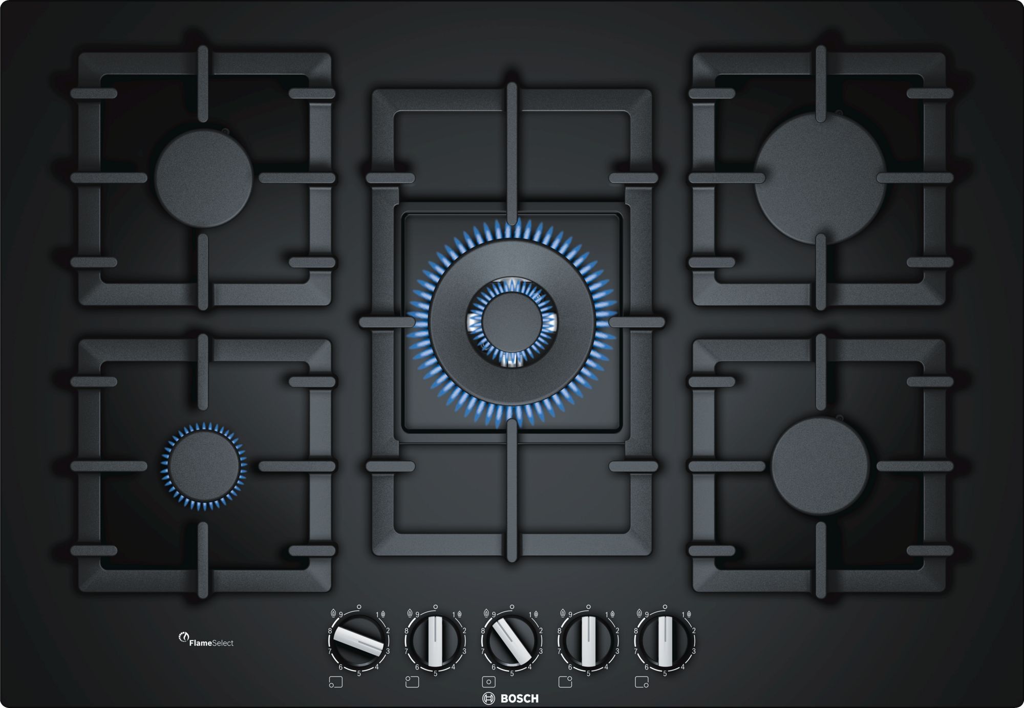 Placa de gas Bosch PPQ7A6B90, 75 cm, vidrio templado negro, con 5 quemadores y encendido automático, diseñada para una cocción eficiente y segura.