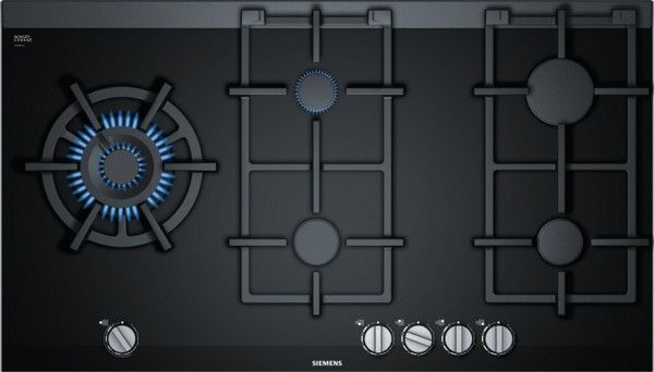 Placa de gas Siemens iQ700 ER9A6SB70 de alta gama con un tamaño generoso de 90 cm y un elegante acabado en cristal negro.