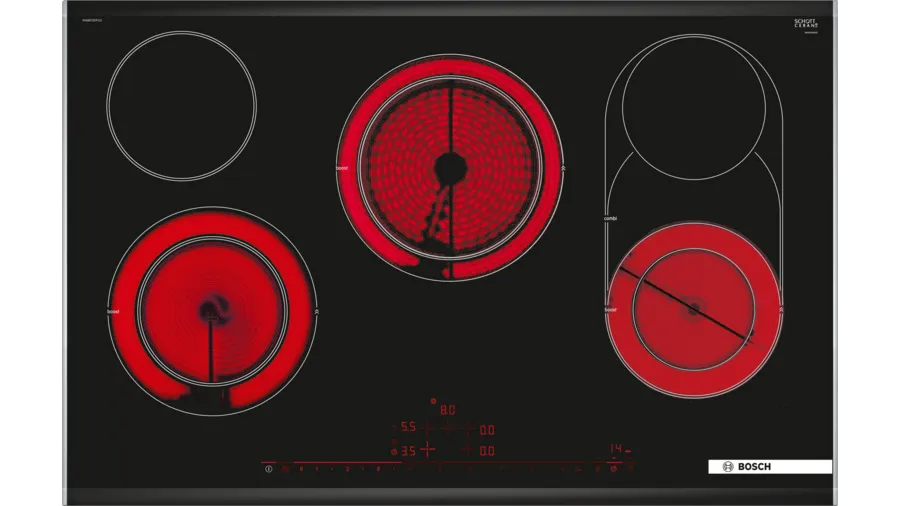 La Bosch PKM875DP1D es una placa vitrocerámica de 80 cm en elegante color negro, diseñada para ofrecer máxima versatilidad y eficiencia en la cocina. Con 5 zonas de cocción, incluyendo una zona gigante de 28 cm y una zona ovalada, se adapta a diferentes tipos de recipientes, desde ollas grandes hasta fuentes alargadas.
