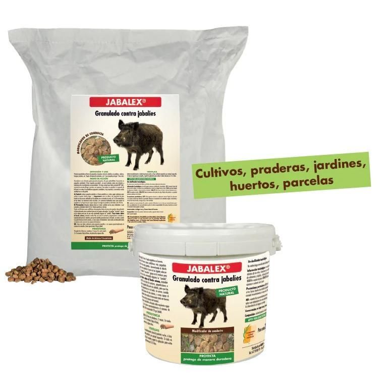 Protecta JABALEX es un reductor de apetencia diseñado específicamente para prevenir los daños causados por jabalíes en cultivos y terrenos agrícolas. Este producto viene en formato granulado, con croquetas de fácil aplicación, que actúan como disuasivos al modificar el sabor de los cultivos, haciendo que los jabalíes pierdan el interés por ellos. Ideal para proteger sembrados y zonas sensibles a las incursiones de estos animales.